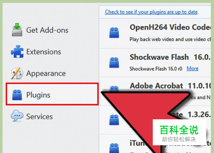 点击附加组件管理器窗口左边的“插件”(Plugins)按钮。荧幕上将显示目前安装在Firefox的所有插件。