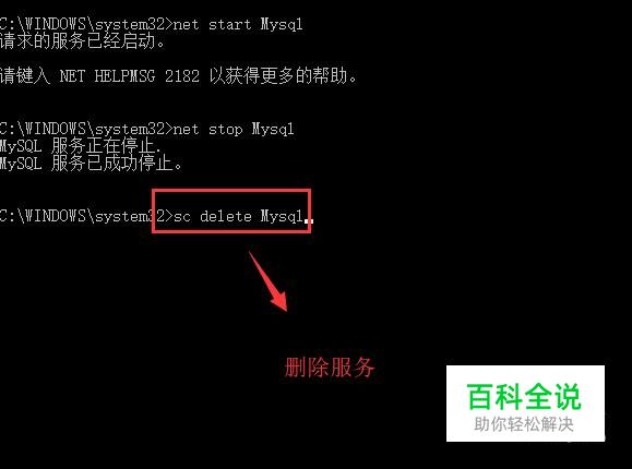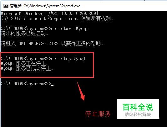 接下来如果想停止所创建的服务,可以运行命令net stop Mysql,如下图所示,命令行会显示服务停止的信息
