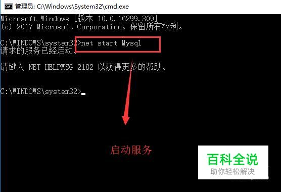 然后我们就可以在命令行中通过net start Mysql命令来开启Mysql服务,如下图所示