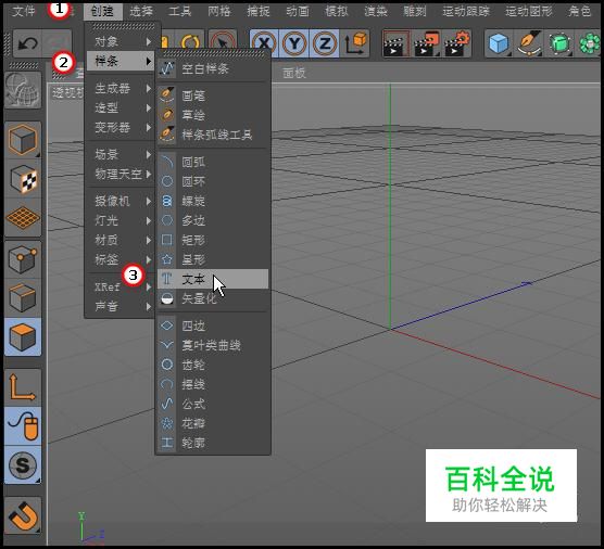 我们启动c4d软件,进入到c4d软件的主界面;再在软件的菜单栏中点击“创建”,弹出的菜单中,我们再点“样条”,接着,再点“文本”。这样就创建了一个文本对象。