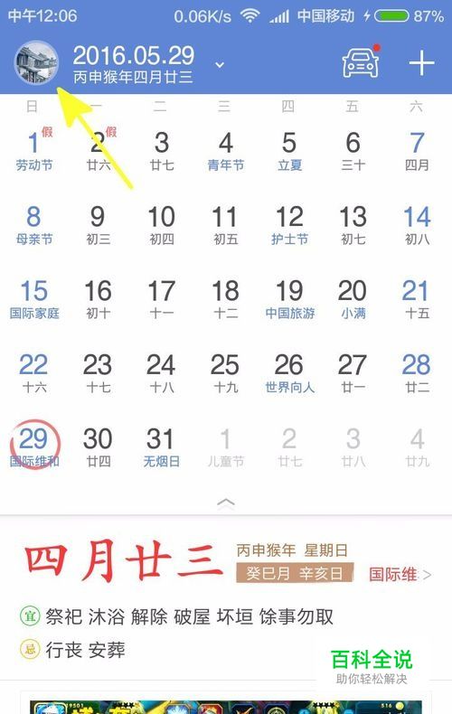 打开手机中华万年历6.5.1,点击页面左上角用户头像