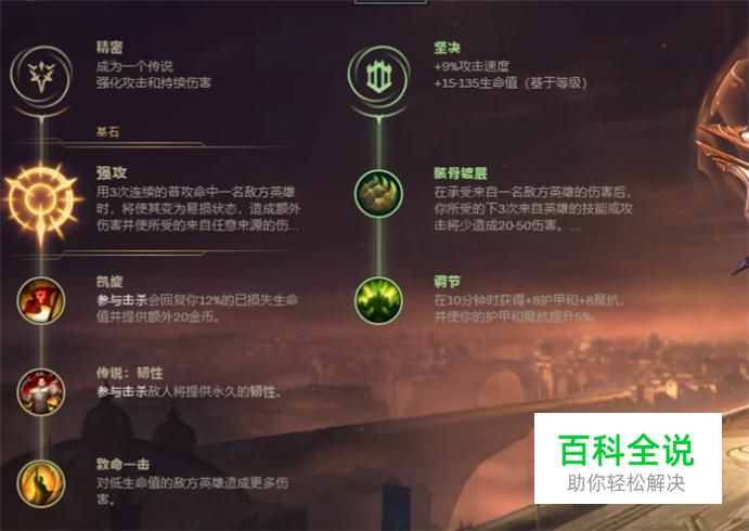 【符文选择】 这是至关重要的一个环节,只有正确的符文才能让你在游戏中发挥英雄的正常水平,一旦点错符文,特别是大的基石符文,很容易导致游戏陷入被动。刀妹的符文也是如此,选择上应该以精密为主,坚决为辅,能打能抗才是王道。具体符文配置如下: