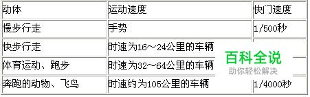 在非闪光摄影中,捕捉某一特定速度的动体所需的快门速度由两个因素决定:与相机平面相对的运动方向和动体影像的大小。拍摄等距离掠过视场的动体要比拍摄斜着朝相机而来或离相机而去的动体要求更高的速度。然而比起以笔直的方向朝向或反向相机运动的物体来,拍摄以斜角方向运动的物体时,快门速度就要求更快一些。不管运动朝哪个方向前进,要将影像拍得大一些,并取得与影像小时一样的清晰度(走近被摄体或使用长焦镜头),就需用较快的快门速度。例如:在3~4.5米距离上,使用标准镜头,拍摄从镜头前横过的动体,快门速度最快时可达到下表所列数字。