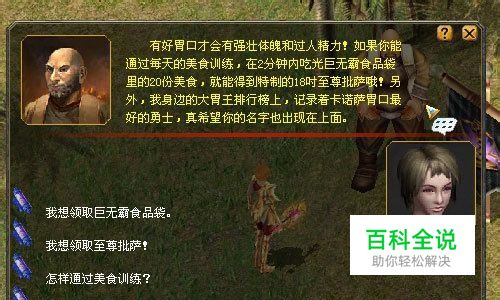 向试炼场内的大胡子教官·阿摩根了解好胃口挑战规则,并通过自动导航找到超级大胃王·鲍博。