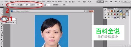 第二步,我们打开PS把照片导进来,点击工具箱中的裁剪工具也就是我画圈1的位置。然后在2的位置输入1寸相片的尺寸宽度为2.5厘米,高度为3.5厘米,分辨率为300.如图: 设置好之后在图片位置拉一个一寸尺寸的的大小,然后调整它的位置点回车键就可以得到一个一寸大小的照片了。