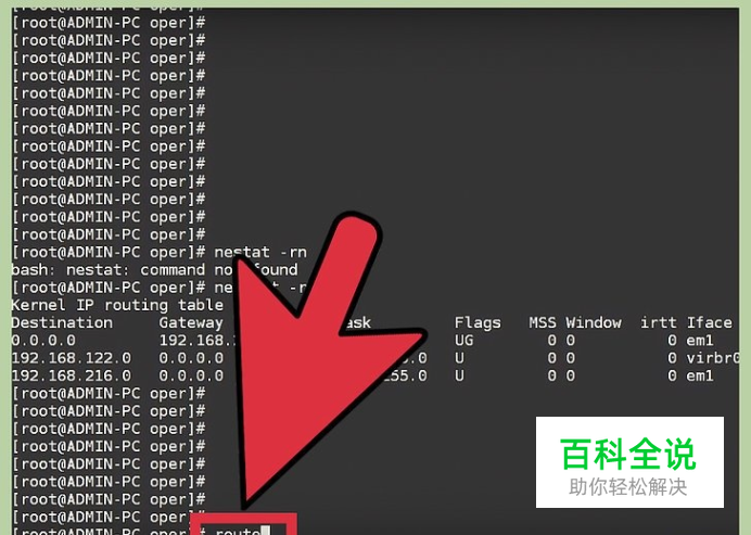 浏览当前默认网关信息。你可以输入,按下,来查看当前的默认网关设置。“默认”旁边的地址会显示当前默认的网关地址,它被分配到的界面则显示在桌面右侧。