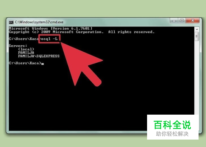打开命令提示符,前往SQL服务器,输入命令osql –L。