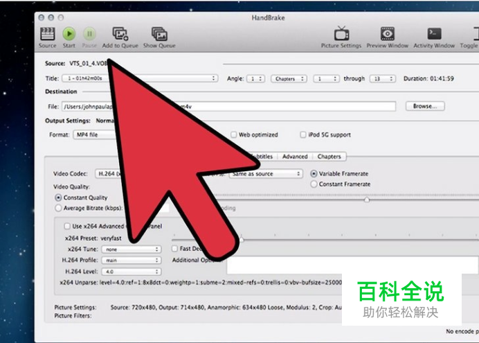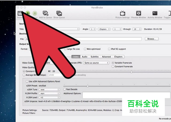 调整设置。如果对结果不满意,可以点击按钮上的标签来调整设置。每个标签都对应视频的一方面。 Picture(图像):可以用来调整视频的分辨率,也可用来将视频里不想要的边角,如黑边裁掉。 Filters(滤镜):视频播放时,就轮到滤镜大显身手了。滤镜能够移除视频的某一图层,为视频增添大片效果。 Video(视频):这个标签可以用来改变视频解码器,也可以调整视频质量,如帧率及视频优化。最为重要的设置选项之一便是“Quality”(质量)。可以在这里调节最终文件的比特率。高比特率意味着高画质,但文件体积也会大幅增加。 “Audiio”(音频):可以用于调节视频源文件中的各个音轨。可以移除不想要的音轨(比如其他语言的音轨),或者单独调节音频质量,而不影响视频质量。 “Subtitles”(字幕):这个标签可以为视频添加字幕文件。通常可以在视频原文件夹里找到字幕文件。 “Chapters”(章节):可以在这里看到视频文件的章节列表。一般在DVD镜像里可以找到不同的章节,你也可以导入自定义通道文件(Channel files)。 “Advanced”(高级):这个选项通常处于隐藏状态。可以通过勾选“Video”标签打开高级选项。高级选项可以让用户对 x264编码器有更多控制。 改变预设可能会导致视频无法在指定设备上播放。如果改变了帧率或画面大小则更是如此。