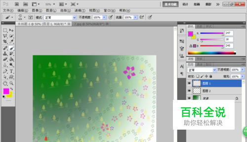 再次选择刚才设计的红色的图形,也定义为画笔预设,选择画笔工具,新建图层,设置画笔的笔尖形状,颜色动态等,修改画笔的颜色,按下鼠标左键,可随意的绘制不同的图案,也可勾选色相,可绘制多种颜色的图案。然后选择背景图层,选择渐变工具,设置前景色到背景色的渐变,修改为深绿色到白色的渐变,选择线性渐变类型,按下鼠标左键,渐变的方向,设置为从左上方到右下方的渐变颜色填充。