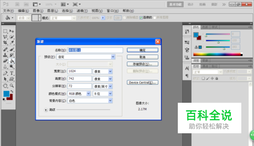 新建一个宽1024*高742像素的白色背景,设置颜色模式为RGB模式,分辨率设置为72,点击确定。在PS软件中新建的白色画布区域,可插入多种图形,也可排版多种文字等。