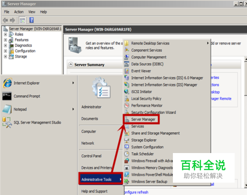 首先单击“开始”菜单,找到“管理工具”,在子菜单定位到“服务器管理”。