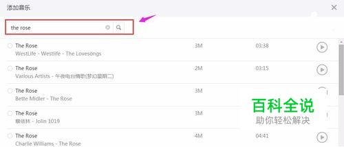 输入你想添加的音乐名称,然后点击试听,试听完之后觉得OK就点左边的圆框选定,点确认。