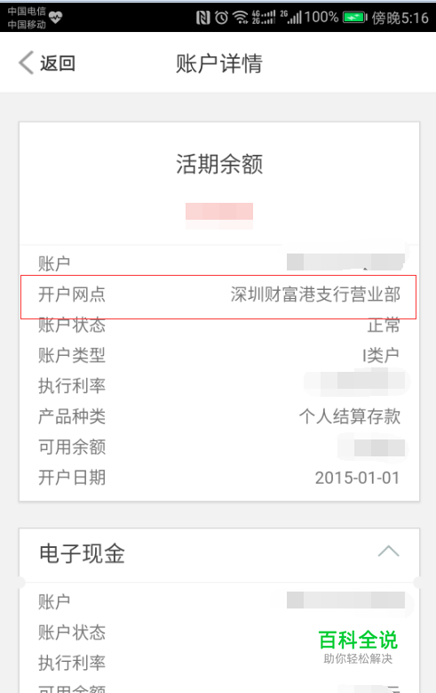 然后就会显示账户详情,在该页面可以看到“开户网点”那一项,这样我们就查找到了银行卡的开户行信息了。