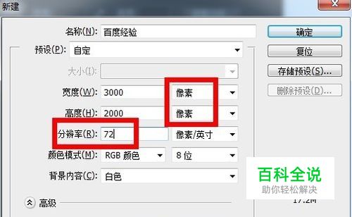 先填一个名称,如果用于网页设计,画布大小的单位,一般选择 像素,分辨率选择 72