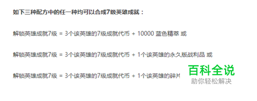 这个是在官网得到的升级配方 7级成就 ①解锁英雄成就7级 = 3个该英雄的6级成就代币 + 10000 蓝色精萃 ②解锁英雄成就7级 = 3个该英雄的6级成就代币 + 1个该英雄的永久版战利品 ③解锁英雄成就7级 = 3个该英雄的6级成就代币 + 1个该英雄的碎片战利品