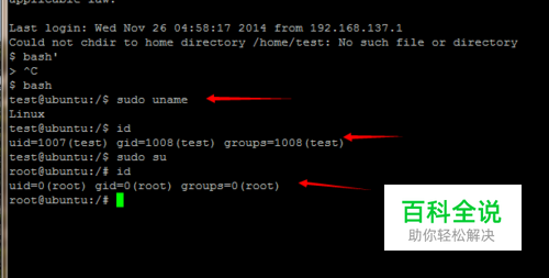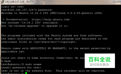 重新以test登陆,执行‘sudo uname’,然后输入sudo密码,ok~ sudo权限搞定
