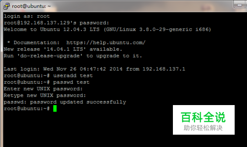 首先以root用户登录,并且新建一个普通的用户。这里以用户test为例
