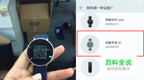 扫描荣耀手表 S1上显示的二维码 →下载APP“华为穿戴”→ 在设备中选择“荣耀手表 S1”