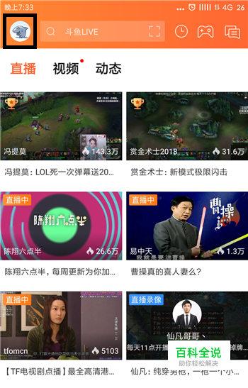在手机中找到斗鱼直播并点击打开,在直播首页中点击左上角的账户头像。