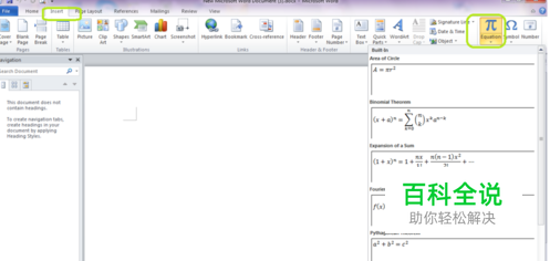 如下图所示,打开word软件后,在上方工具栏中选择插入选项,然后在右边点击π一样的符号(公式),然后选择插入新公式。