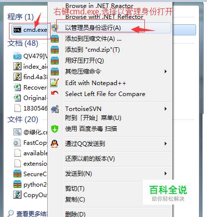 打开dos命令窗口,打开窗口时请以管理员的身份打开。 开始->输入cmd->找到cmd.exe->右键cmd.exe->以管理员身份打开(弹出菜单)->打开dos命名窗口。