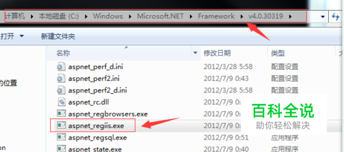 打开framework4.0所在目录,一般情况下在此目录下:C:\Windows\Microsoft.NET\Framework\v4.0.30319。 找到文件:aspnet_regiis.exe