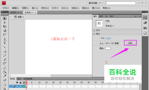首先,我们需要改变舞台的尺寸和颜色,你要做的是鼠标点一下舞台,然后, 在属性里单击“编辑...”,弹出“文档属性”对话框,设置尺寸和背景颜色,按如图所示进行设置,如图所示