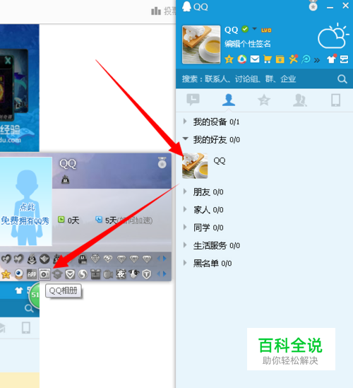 点开好友列表,然后点到自己,在弹出的个人信息框的图标列表找到QQ相册图标,如图,然后点击该图标进入。