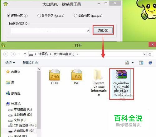 来到大白菜pe桌面,系统会自动弹出大白菜pe装机工具,点击“浏览”,找到你的u盘,然后点击选择之前存放在u盘根目录的win10系统镜像,点击“打开”进入下一步操作。