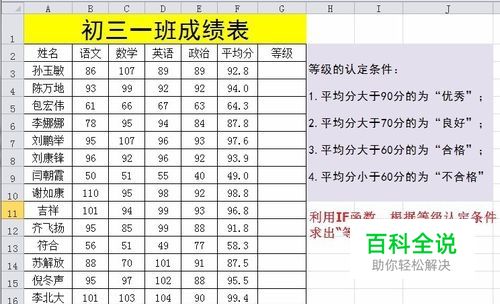 原始题目,求出等级认定:平均分大于90分为优秀;平均分大于70分为良好;平均分大于60分为合格;平均分小于60为不合格。