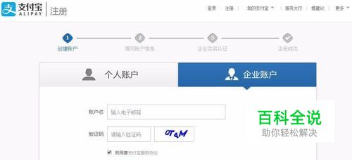 首先需要注册一个企业用的支付宝帐号 【注册前需要准备的资料】: ①营业执照影印件(影印件必须为彩色原件的扫描件或数码照); ②对公银行帐号,可以是基本户或一般户; ③法定代表人的身份证影印件。 ---------------------------------------------------------------------------- 一、【创建账户】 准备好上述资料以后 ①那么输入你的企业邮箱作为登录的账户名; ②接下来会需要输入手机号码验证,但该号码不会作为绑定用途; ③验证手机号码之后,会提示验证邮箱账户名,前往邮箱打开邮件的验证链接进行验证即可;