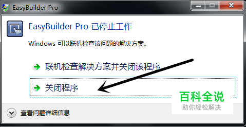 打开电脑,点击打开一个电脑软件,此时会弹出一个提示框,提示我们该软件已停止工作,这样软件就无法正常运行,我们点击提示框上的【关闭程序】按钮,将软件关闭。