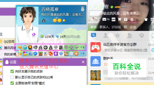 【进入腾讯充值页面】打开QQ面板,将鼠标指向自己的头像(开了封面模式的指向自己的昵称), 展开迷你资料卡,在业务图标里,选择并点击要开通的包月服务,也可以随意选择点开一个服务,进入充值中心后再选择业务。