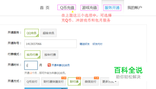 【选择好友】在充值页面的#开通账号#旁可以选择好友,白框内可以直接输入QQ账号, 但没有7天的好友不能帮他开通业务。然后选择开通时长(Q币、游戏币输入数量)、支付(开通)方式,下面的自动续费一般不会有人去勾选!