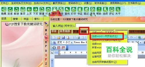 接着,打开友益文书,导入待转换的word文档(怎样导入文档请参考友益文书的帮助菜单),如下图2所示,在友益文书的编辑栏上单击“转换”按钮,在弹出的选项里选“当前word>网页格式”。