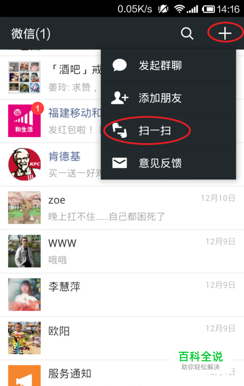 或者打开界面顶部的”+“符号,在下拉菜单中找到”扫一扫“。