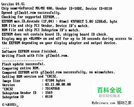 如何刷新NVIDIA显卡BIOS 1.确认ROM芯片是否支持刷新 通过启动盘进入到纯DOS环境下,在命令提示符后输入“nvflash -c”,测试显卡BIOS所使用的ROM类型。如果刷新程序支持显卡的ROM芯片,则会列出该芯片的详细信息(如图1),反之则出现错误提示。 此主题相关图片如下: 小提示: nvflash和各种命令参数配合使用时,可以实现不同的功能: -f :将名为“filename”的BIOS文件写入显卡的ROM芯片中,然后进行校验 -b :从显卡的ROM芯片中读取BIOS,并以“filename”的名字保存 -k :从显卡的ROM芯片中读取BIOS,并与名为“filename”的BIOS文件比较 -c:检测显卡ROM芯片是否支持刷新 -h:BIOS升级完成后重启机器 -?:获取刷新程序的详细说明,包括命令行参数、支持的ROM芯片等 2.备份当前BIOS 备份BIOS的参数是“b”,其命令格式是“nvflash -b ”,即备份显卡BIOS,并存为“filename”文件。此外,备份BIOS的工作还可以事先在Windows下完成,即通过NVIDIA BIOS Editor这个软件进行备份。 3.刷新BIOS过程 完成备份工作以后,再输入“nvflash -f ”即可将新的BIOS写到ROM芯片中。刷新过程中,屏幕会有所抖动,并变黑,持续时间在10秒左右。如果再次回到DOS界面,那么刷新成功了(如图2)。