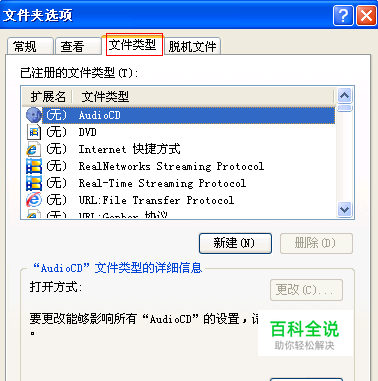 在“文件夹选项”对话框中,单击“文件类型”选项卡。