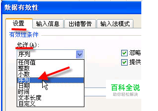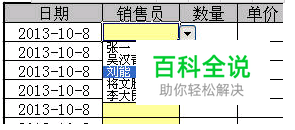 如下图所示,要求在销售员一列设置可以选取的下拉菜单。 打开数据有效性窗口(excel2003版数据菜单 - 有效性,excel2007和2010版本 数据选项卡 - 数据有效性 - 数据有效性),在窗口中的“设置”选项卡里选“序列”。