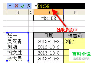 技巧1 怎么快速把单元格的内容用逗号连接起来。例如把上图中的B4:B8区域的销售员用逗号连接起来。 步骤1:任选一个单元格,输入公式=B4:B8,然后在编辑栏中选取公式部分,如下图所示。 步骤2 再按F9把公式转换成值 ={"张一";"吴汉青";"刘能";"将文胜";"李大民"} 对这个字符串删除掉前面 “ ={" ” 和后面的 “ "} ” 再把 “ ";" 通过替换功能替换“,”(逗号)即可.