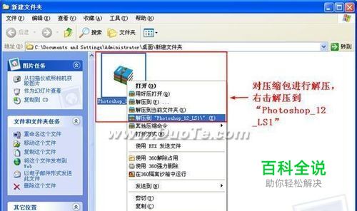 右击压缩包,选择“解压到‘Photoshop_12_LS1’”(如下图所示)。解压出一个与压缩包名同名的文件夹。