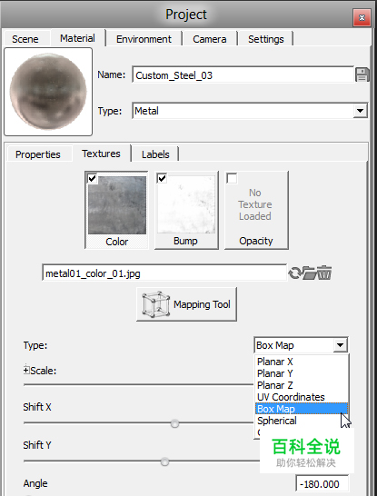 设置贴图类型 这一步开始改善纹理的外观,KeyShot里有7种类型的纹理贴图,分别为:平面X轴映射、平面Y轴映射、平面Z轴映射、盒贴图、UV坐标、球形映射和圆柱形映射,通常,盒贴图适用于大多数情况: