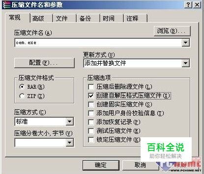 二、制作成自解压文件 选中上面制作的这两个文件并右击,选择“添加到压缩文件”命令,在“压缩文件名”下的文本框中输入oem.exe,并勾选“创建自解压格式压缩文件”前的对勾(如图2);接着切换到“高级”选项卡,点击“自解压选项”按钮,在弹出窗口的“解压路径”下输入:C:WINDOWSsystem32,点击“确认”按钮,OEM的信息就制作好了。 图2