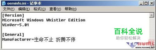 一、准备OEM信息 (1)打开记事本程序,在其中输入以下几行内容(如图1): 图1 [Version] Microsoft Windows Whistler Edition WinVer=5.01 [General] Manufacturer=** (**可根据自己的喜好进行更改) 随后将该文件保存为oeminfo.ini。 (2)准备一张小于160×120像素的Bmp格式图片,将其重命名为oemlogo.bmp。天空软件站提醒大家,该图片就是用于XP系统属性中制造商区域。