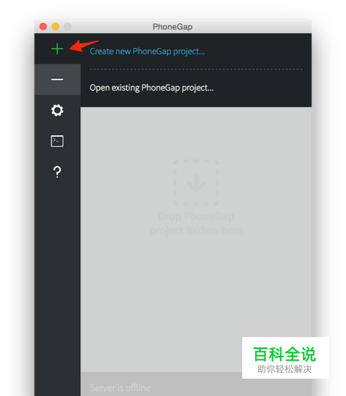 接下来,开始创建默认的Hello World项目。 首先,打开电脑上已安装好的软件,点击加号,选择Create new PhoneGap project。