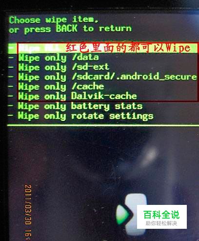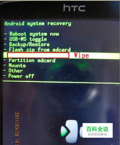 看图操作:(上下触摸光学感应键选择,按下确认) 注:按照上图中的操作是完全wipe, 一般只wpie第1项就可以!!如果对自己的机器状况不是很了解的话,就按上图中的操作2—6 全部wipe,简单粗暴而且很有效。