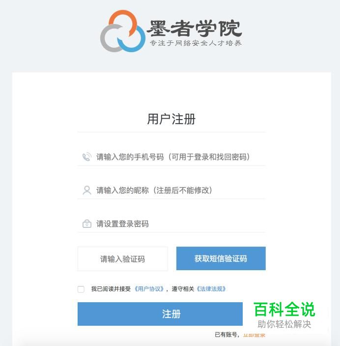 打开墨者学院网站,点击右上角注册按钮,注册成为新用户。