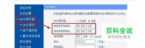 一、查看地址池的范围 在手机或电脑上打开浏览器,在浏览器的地址栏中输入路由器的IP地址,然后登录进入路由器的管理页面,打开“DHCP服务”(作用是自动为联网设备分配IP地址),查看地址池的IP地址范围是192.168.7.100--192.168.7.199。