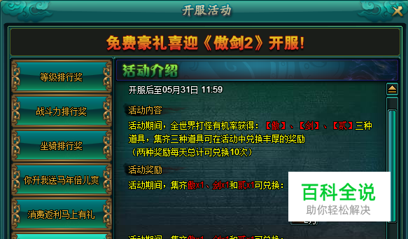 8090傲剑2很多玩家进游戏之后,在第一天的升级过程中都会获得一些傲剑贰的字样,在背包但是不知道这些字有什么用,实际上这个是新区的活动,可以用来兑换奖励的,集字活动。下面就详细介绍一下傲剑2三个字怎么兑换。 首先,必须要集齐这三个字才行,每个字都要有一个才能兑换奖励,只有新区才有这个活动。活动期间,集齐傲剑贰三个道具可以兑换丰厚奖励,点击游戏上方的精彩豪礼,然后打开开服活动。再点击免费大兑换,就可以进入兑换的界面了。 活动有两种奖励,第一种可以兑换2万兽魂,用来升级坐骑。第二种可以兑换成2万宝石精华,用来升级宝石。这两种奖励都是兑换次数限制的,两种加起来每天一共可以兑换10次,所以大家每天利用好这10次的兑换机会。 8090傲剑2这三个字每天10次兑换机会,对于升级坐骑和宝石都有不错的作用,所以建议大家多打一些这些字。