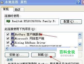 (二)安装NetWare客服端: 1、鼠标右健点击“本地连接”打开属性,卸载 NetWare客户端;